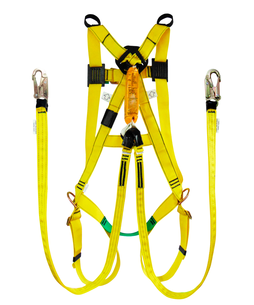 Inicio / Productos / Arneses/Arneses Generales/Kit/Kit arnés de 2 anillas, 3 hebillas y línea de vida/conexión doble de 1,80 m con amortiguador de caída y dos ganchos chicos de 3/4″