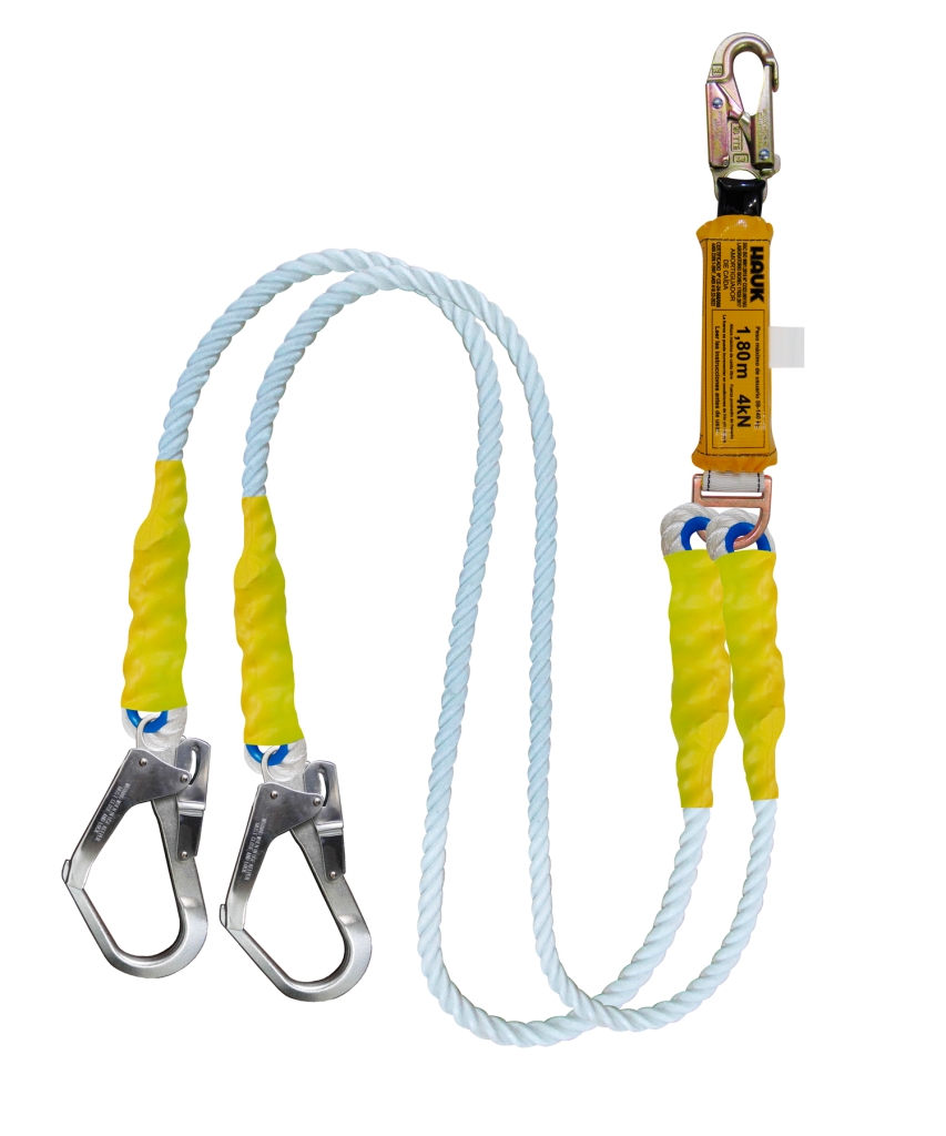 Inicio / Productos / Líneas de vida/conexión con amortiguador de caída/Amortiguador de caída para 1,80 m - Factor 1/Cabo torcido de nylon / poliéster de 5/8"/Línea de vida/conexión doble, con amortiguador de caída factor 1, de cabo torcido de nylon/poliéster de 5/8″, un gancho de 3/4″ y dos ganchos de 2 1/4″