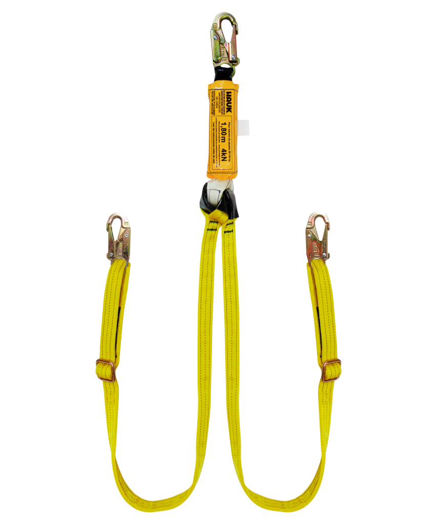 Inicio / Productos / Líneas de vida/conexión con amortiguador de caída/Amortiguador de caída para 1,80 m - Factor 1/Cinta de políéster de alta tenacidad, regulables/Línea de vida/conexión, regulable, doble, con amortiguador de caída factor 1 y tres ganchos de 3/4″