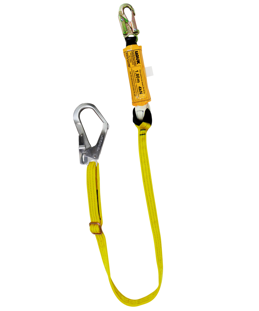 Inicio / Productos / Líneas de vida/conexión con amortiguador de caída/Amortiguador de caída para 1,80 m - Factor 1/Cinta de políéster de alta tenacidad, regulables/Línea de vida/conexión regulable, con amortiguador de caída factor 1, de cinta poliéster, un gancho de 3/4″ y un gancho de 2 1/4″