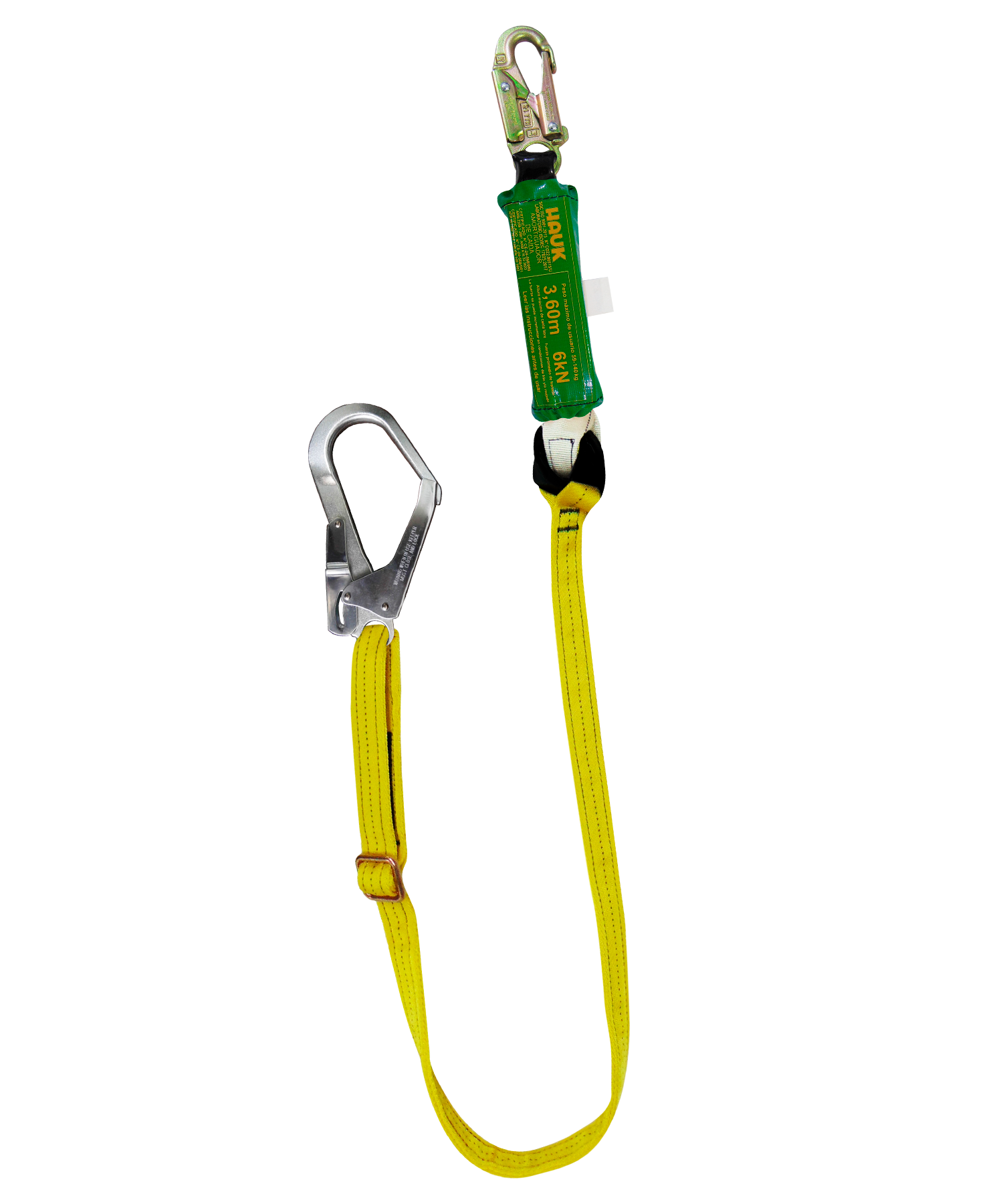 Inicio / Productos / Líneas de vida/conexión con amortiguador de caída/Amortiguador de caída para 3,60 m - Factor 2/Cinta de poliéster de alta tenacidad, regulables/Línea de vida/conexión regulable, con amortiguador de caída factor 2 – altura máxima de caída 3,60 m con un gancho de 3/4″ y un gancho de 2 1/4″